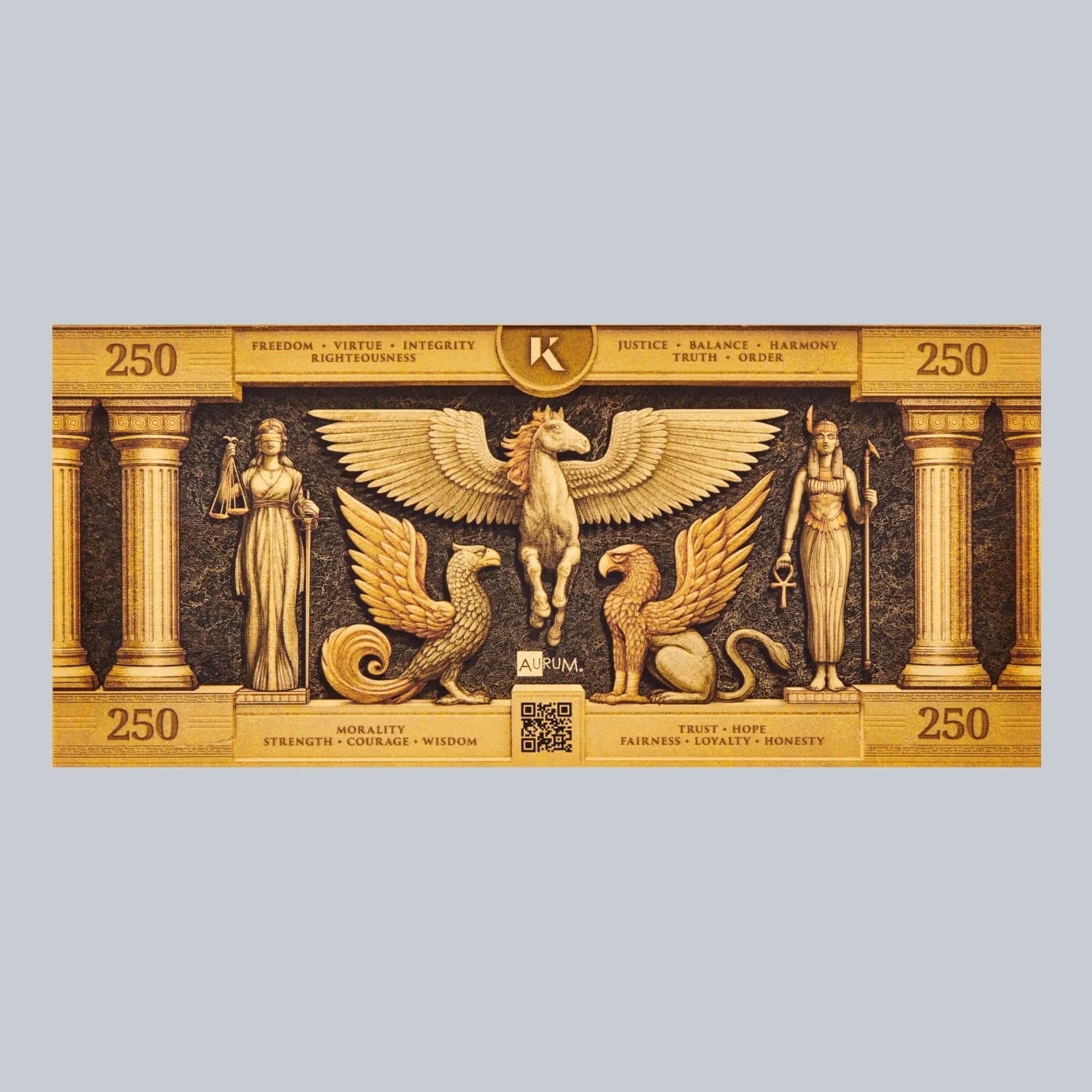 The reverse features the five central mythical figures and deities found on all Kinesis bullion products. The Kinesis and Aurum® logos appear alongside a QR code that links to our website, where the story of the Kinesis gold notes is told.